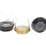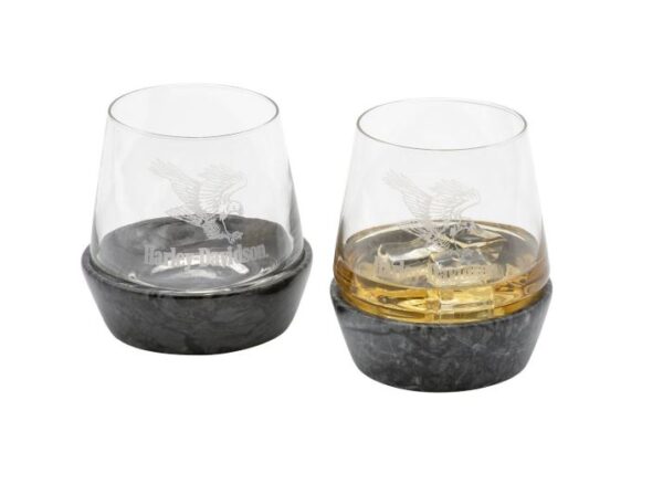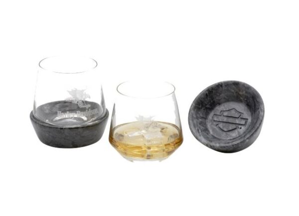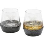 Set of two 12 oz. / 360 ml glasses with removable granite bases. Features etched Swooping Eagle graphic on the glass and embossed Open Bar & Shield logo on the stone coaster base. Hand wash only.
