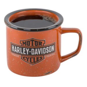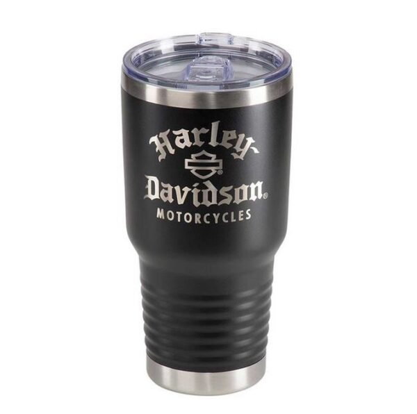 Harley-Davidson® Old English Travel Tumbler – 30 Oz. Double-Wall Stainless Steel HDX-98666. 30 oz. / 900 ml double-wall stainless steel (vacuum insulated), travel tumbler with matte black finish. Laser engraved Open Bar & Shield and Old English Harley-Davidson® logo. Hand wash only. Do not microwave.