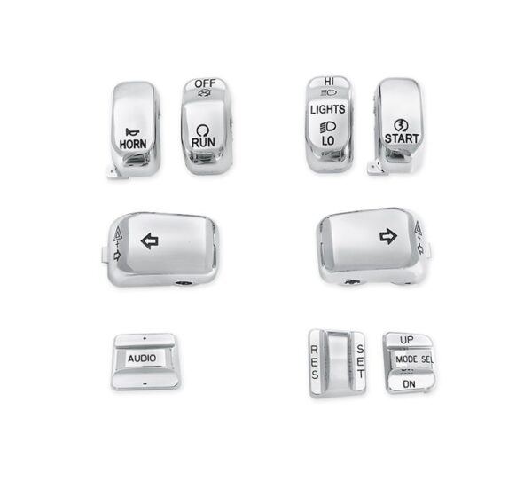 Not satisfied until everything you see is chrome? These Chrome Switch Cap Kits will add style to one of the most visible areas of your bike, the switches. Kit contains a complete set of chrome switch caps for the left and right handlebar switches Caps are a direct replacment for the standard equipment black switch caps Replace the stock black caps without re-wiring Shaped for the same ergonomic feel as the Original Equipment hand control switches Chrome switch caps complement other chrome hand control accessories (Chrome Master Cylinder Kit, Chrome Hand Levers, Chrome Switch Housings and Chrome Master Cylinder Cover)