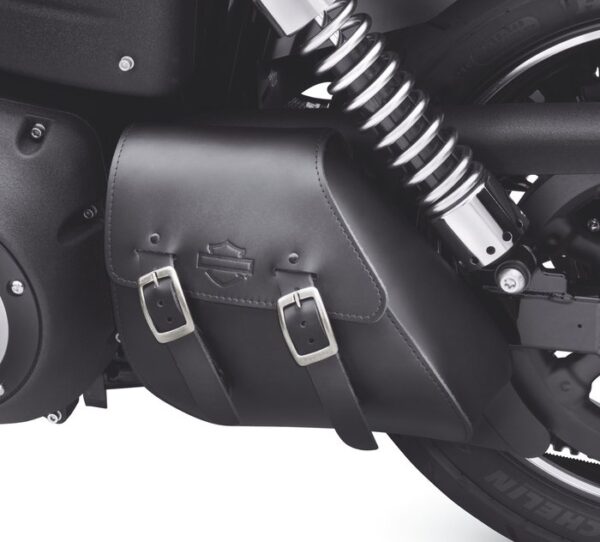 Less is more. With enough room for the essentials, these stylish Single-Sided Swingarm Bags eliminate the need to stuff your pockets or bungee a bag across the passenger pillion. Black leather Shaped to hug the contour of your bike’s frame, these compact bags add an old school look Bags are constructed of heavyweight leather, and feature a pouch-style flap lid that is secured with two quick-disconnect clips that are hidden behind traditional straps and buckles The semi-rigid-backed bag is secured to the left side of the bike with easy-to-install brackets and adjustable straps Luggage capacity: 265 cubic inches total
