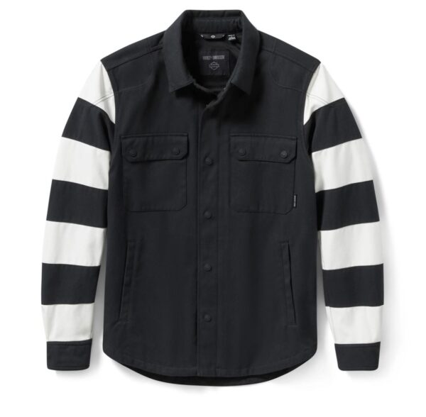 Throwback moto styling synchs with functional riding protection in our latest H-D® Breakout Operative 2.0 Riding Shirt Jacket. Its heavyweight twill blend features a partial lining to feel more like a shirt than a jacket. It has reflective material to enhance visibility, a hidden snap-down collar that won’t flap around during rides, and is equipped with superior impact protection from our D3O® Ghost™ armor at the shoulders and elbows. This men’s motorcycle shirt jacket is also tested and certified to meet abrasion, tear, and seam strength requirements (more details below). It’s finished with sleeve striping and felt patch graphics inspired by our 1920s racing team jerseys. Get familiar with the specs below, then order yours ASAP.