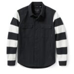 • Design Details: Split Mandarin collar. Contrast piecing. Embossed leather shoulder detail.