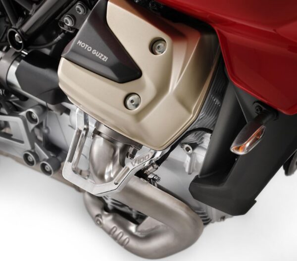 Elegant manifold protection made of aluminum and machined from solid, it protects the exhaust manifold and the cylinder from accidental falls. It was designed to blend in with the elegant lines of the engine. It is sold in a single piece to allow its replacement in the event of a fall from only one side of the motorbike.