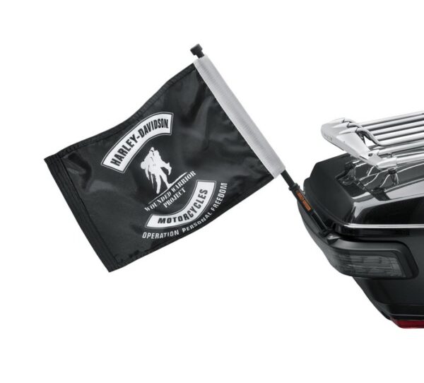 Raise the flag and salute our returning veterans who incurred service-connected injuries or illness. Harley-Davidson will donate 10% of the manufactureru2019s suggested retail price of this item to Wounded Warrior Project (WWP). Harley-Davidsonu2019s commitment to WWP is part of Harley-Davidsonu2019s Operation Personal Freedom Campaign to improve the lives of servicemen and women who are living with post-traumatic stress disorder (PTSD) and help more veterans experience the freedom and of the open road. Tour-Pak Mount Easy to install Manufactured with high-quality nylon for durability Designed for parade use only and will not withstand high-speed use 14″ wide x 11″ tall