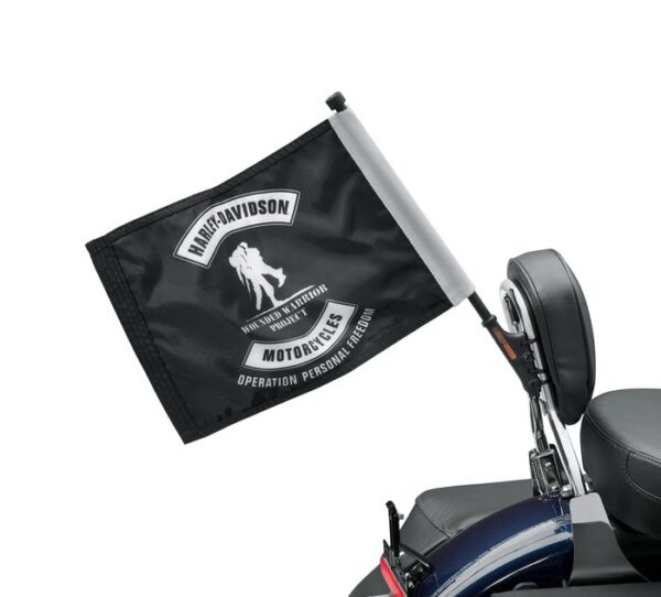 Raise the flag and salute our returning veterans who incurred service-connected injuries or illness. Harley-Davidson will donate 10% of the manufactureru2019s suggested retail price of this item to Wounded Warrior Project (WWP). Harley-Davidsonu2019s commitment to WWP is part of Harley-Davidsonu2019s Operation Personal Freedom Campaign to improve the lives of servicemen and women who are living with post-traumatic stress disorder (PTSD) and help more veterans experience the freedom and of the open road. Sissy Bar Mount Easy to install Manufactured with high-quality nylon for durability Designed for parade use only and will not withstand high-speed use 14″ wide x 11″ tall